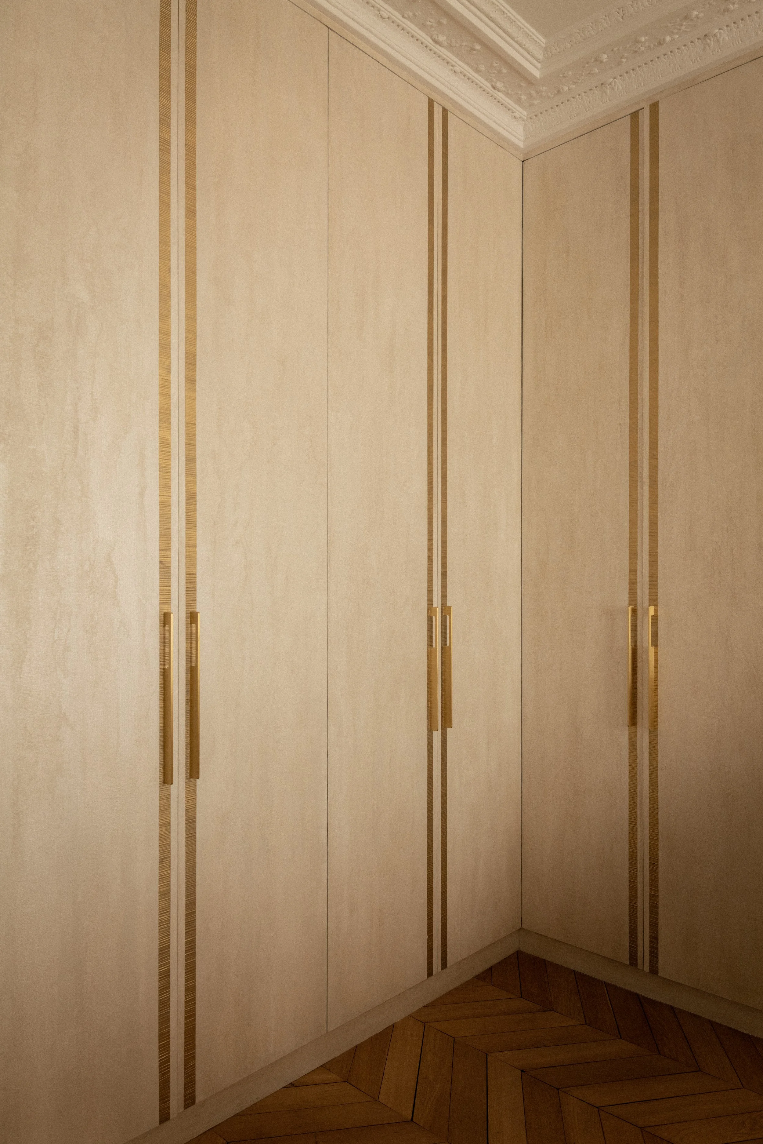 Parquet point de Hongrie, moulures, cheminées, hauteurs sous plafond : ces éléments patrimoniaux sont conservés et mis en valeur, mais jamais figés. Ils cohabitent avec des lignes épurées, des cuisines contemporaines, des salles de bain minimalistes.