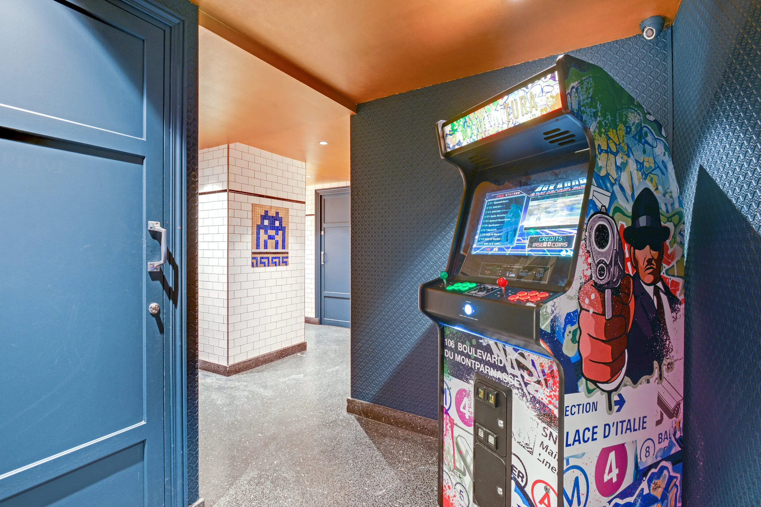 Les luminaires en verre de Murano, importés directement d’Italie, ajoutent une touche de raffinement et d'authenticité, tandis que le four à pizza et la vaisselle aux effigies du restaurant, également importés d’Italie, renforcent le caractère authentique de l’établissement. Des néons sur mesure et des œuvres inspirées des Space Invaders ont été intégrés pour ajouter une dimension ludique et contemporaine à l'ensemble.